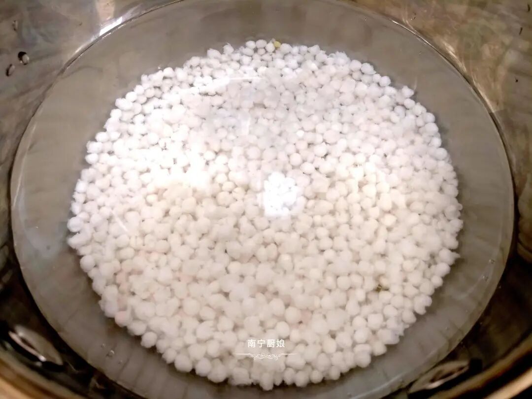 2、趁蒸紫薯的空挡,我们把西米放在奶锅里,加入没过西米2个指节的水量把水烧开,这里要提醒的是,西米不要过清水清洗了,以免煮出来变迷糊了哦!把西米煮到呈现透明状,里面有个小白点,然后关火,盖上锅盖用余热把西米完全煮至透明,然后捞出来过滤网冲洗干净沥干待用