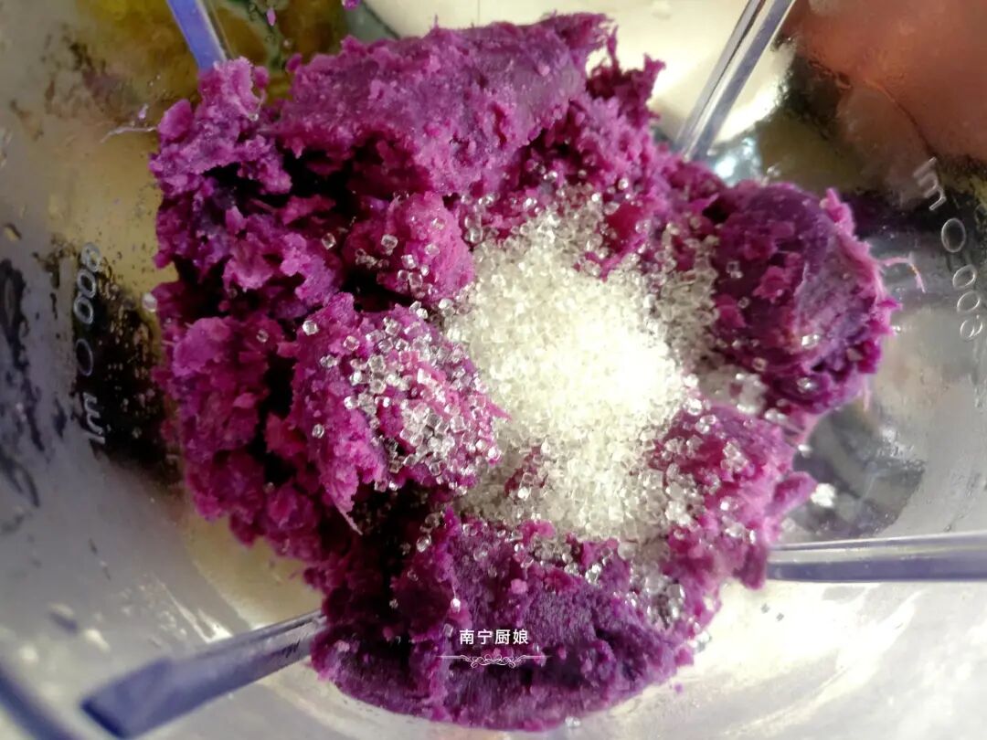 5、把紫薯倒进搅拌机里,放入半勺的白糖(如果你喜欢吃甜点就多放点,我2根紫薯的量放半勺,我觉得甜度刚好合适,而且紫薯本身也是有糖分的)