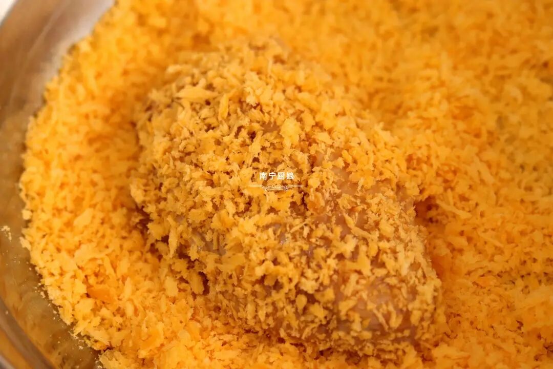2、打一个鸡蛋把鸡蛋清沥出来,把面包糠倒在大盘子里,把腌制好的鸡中翅在鸡蛋清里过一遍,然后在面包糠里打滚,均匀的沾上面包糠