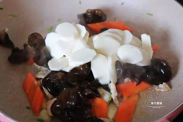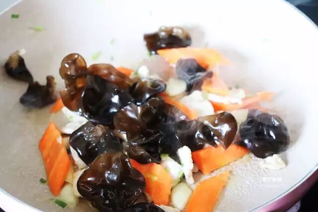 4、接着依次把胡萝卜片和黑木耳也倒入锅中一起翻炒均匀,这个时候可以用中火快炒,毕竟胡萝卜还是有点难炒熟的。匀。在这个过程中,可以用一个小锅装半锅水烧热,然后把山药片放入焯水。