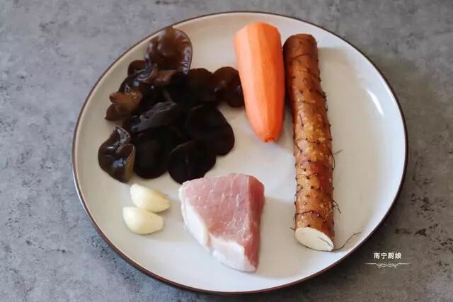 我们来准备好食材:山药半根、胡萝卜小半段、黑木耳50克、猪瘦肉100克、大蒜2粒、香葱1根、食盐1勺。