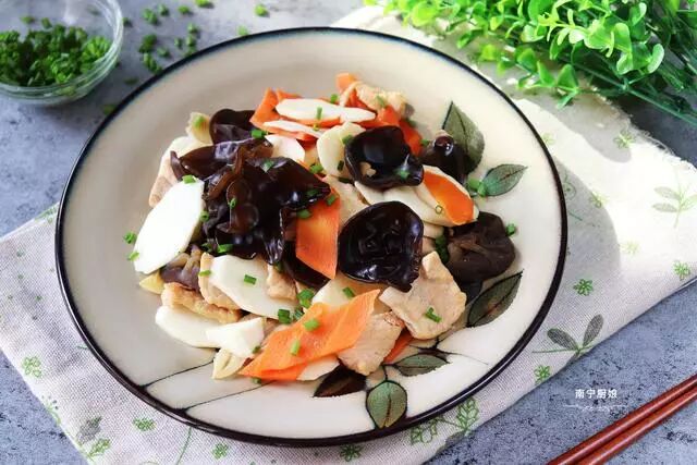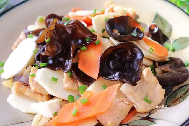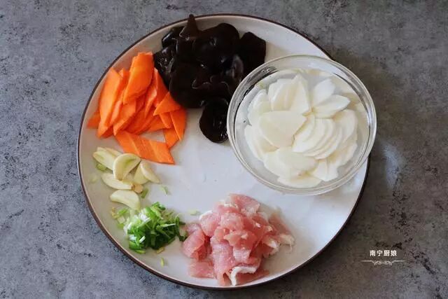 1、山药去皮的时候一定要戴上手套,要不然会手痒哦!把山药去皮后切成片后放入凉水中浸泡着,这样做的目的是防止山药和空气接触后氧化变黑,接着把黑木耳清洗干净,胡萝卜去皮后切片,大蒜也切片,香葱洗净后切碎,猪肉洗净后切薄片。
