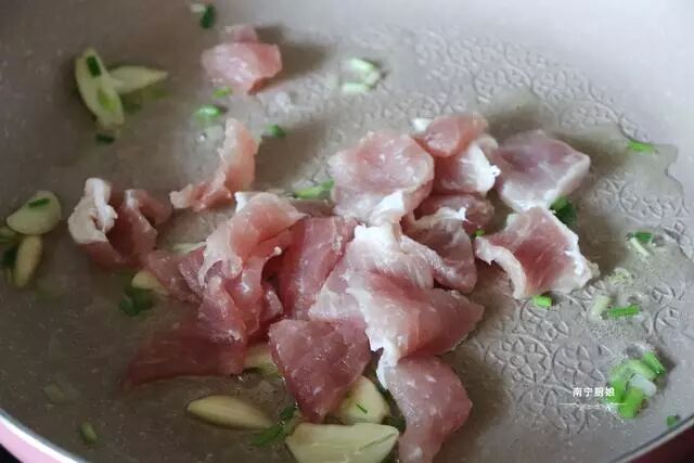 3、把切好的猪肉片也倒入锅中,用小火炒至肉色发灰。