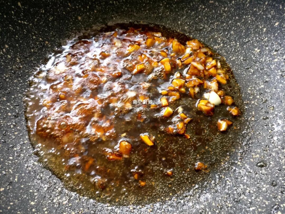 4、倒入3勺生抽进入,倒进去的时候由于油处于高温状态,所以小心生抽倒进去的时候遇油会爆汁出来烫到手哦
