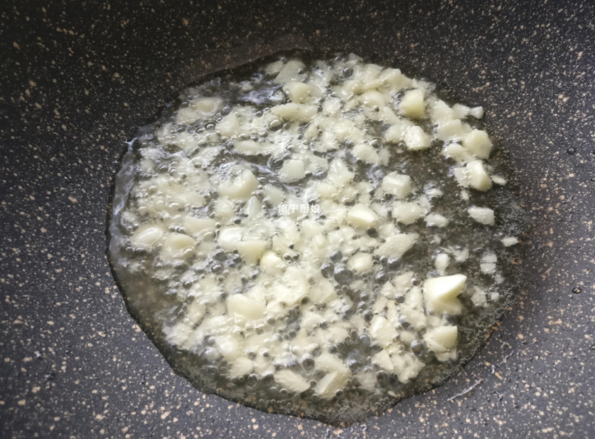 3、在锅里倒入适量的花生油,小火烧热,把蒜米倒进去爆香