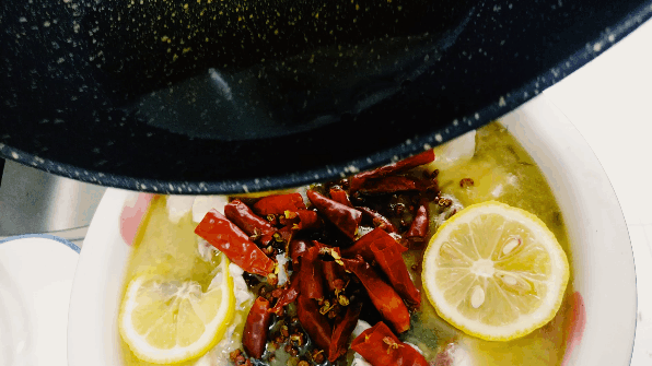 10、盛出大碗里,放入干辣椒和花椒以及柠檬片