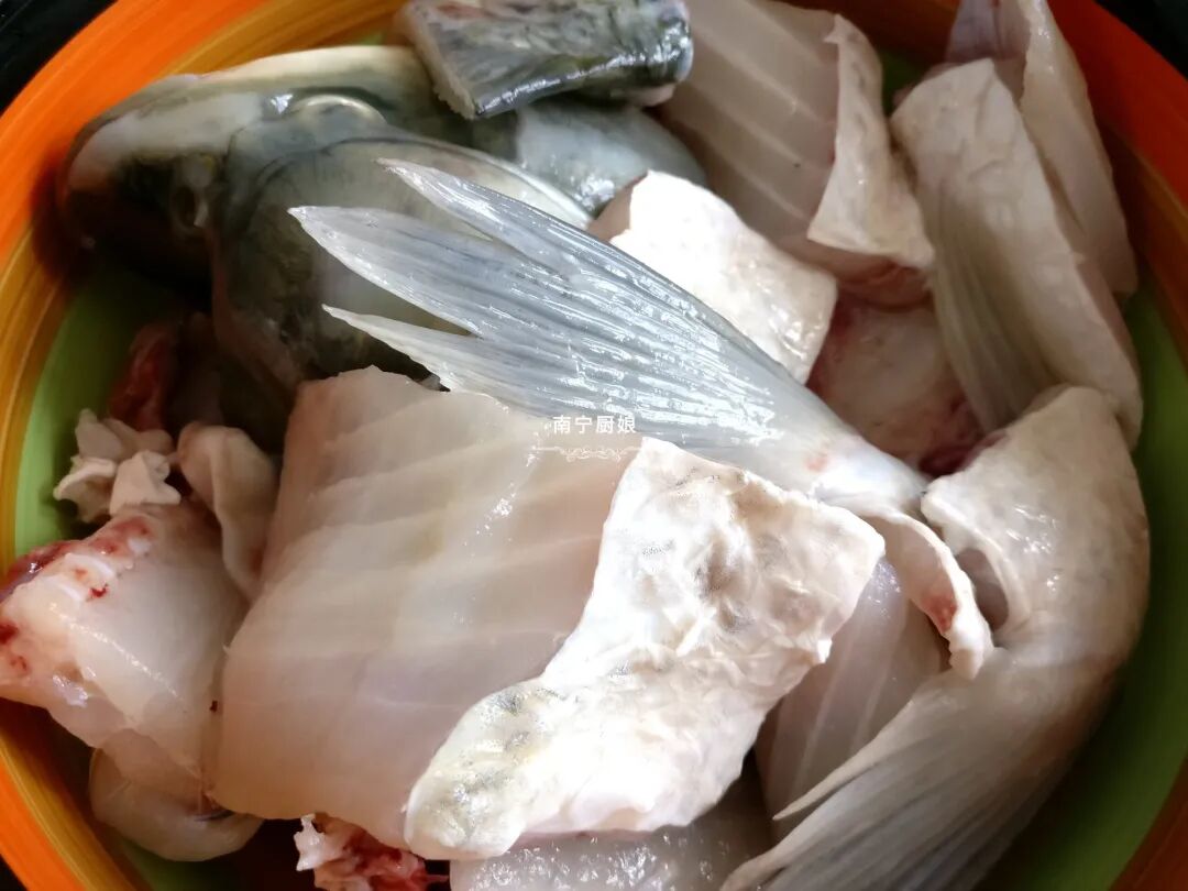 1、我买鱼的时候已经让店家帮我处理切片了,所以回来就直接清洗干净后,把鱼骨部分放在碗里,倒入3勺料酒和1勺食盐腌制