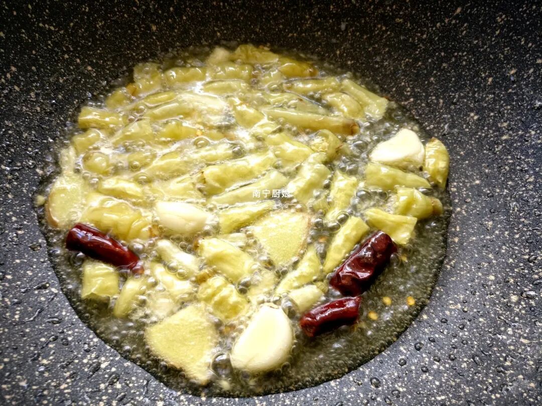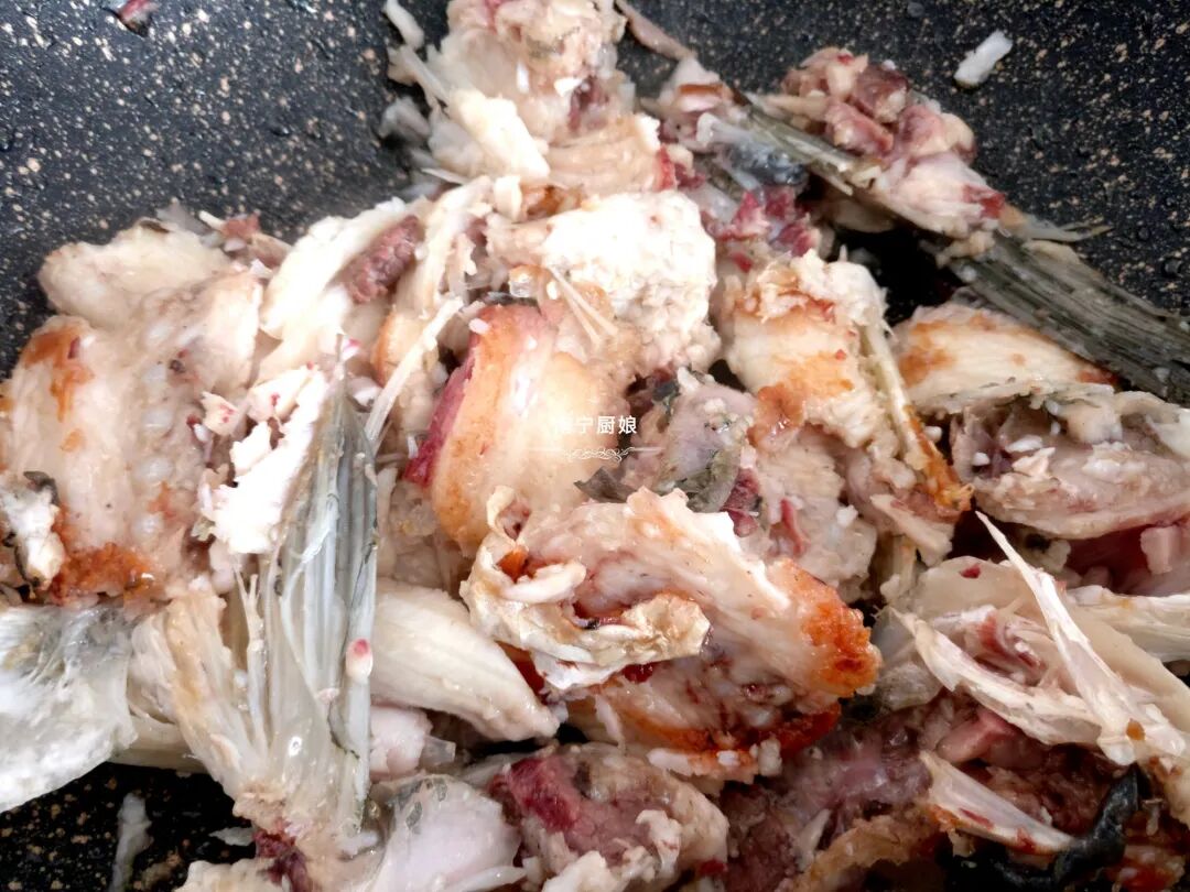 4、起锅,倒入适量的油,把腌制好的鱼骨倒进去煎炒至表面微微焦黄