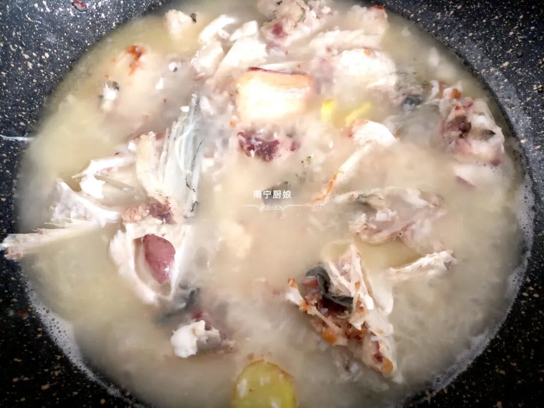 5、然后倒入没过鱼骨的开水,开大火烧开,鱼汤就变得又白又浓了,越烧越香,调小火大概煮上10分钟即可,鱼汤煮白后盛出装碗待用