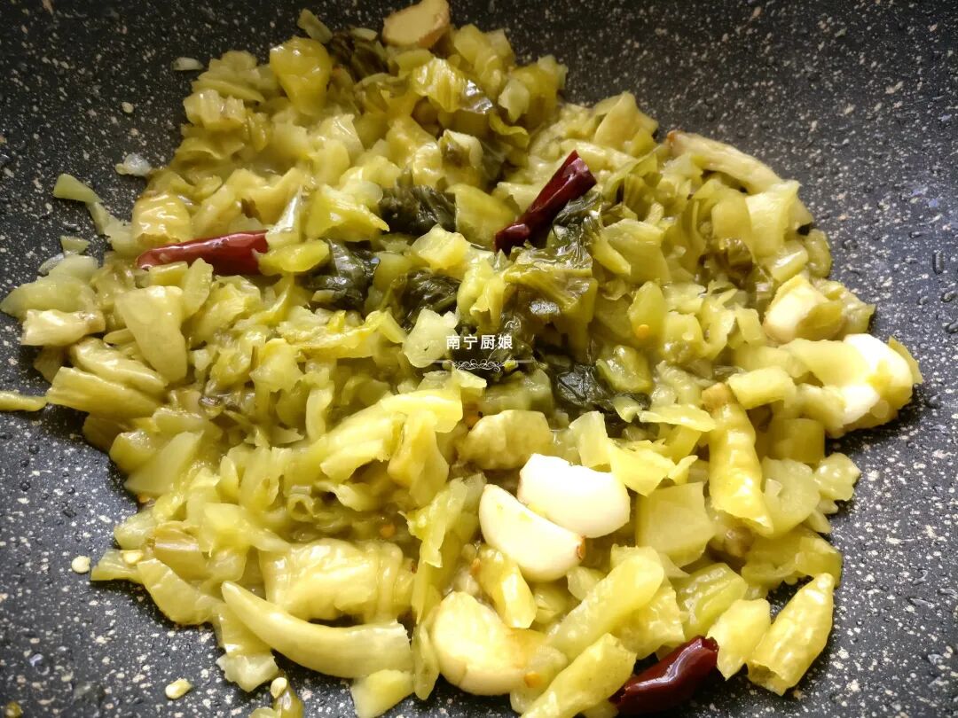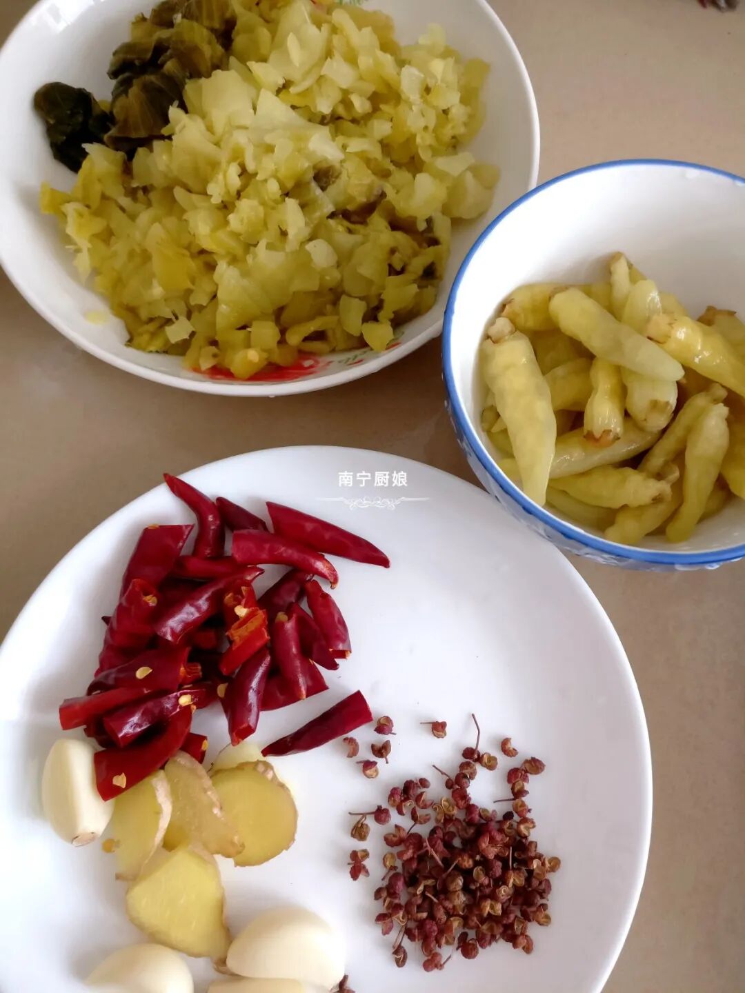 3、趁腌制鱼的时候,我们把酸菜清洗后切碎,泡椒切段,干辣椒切段,生姜切片,蒜米拍裂