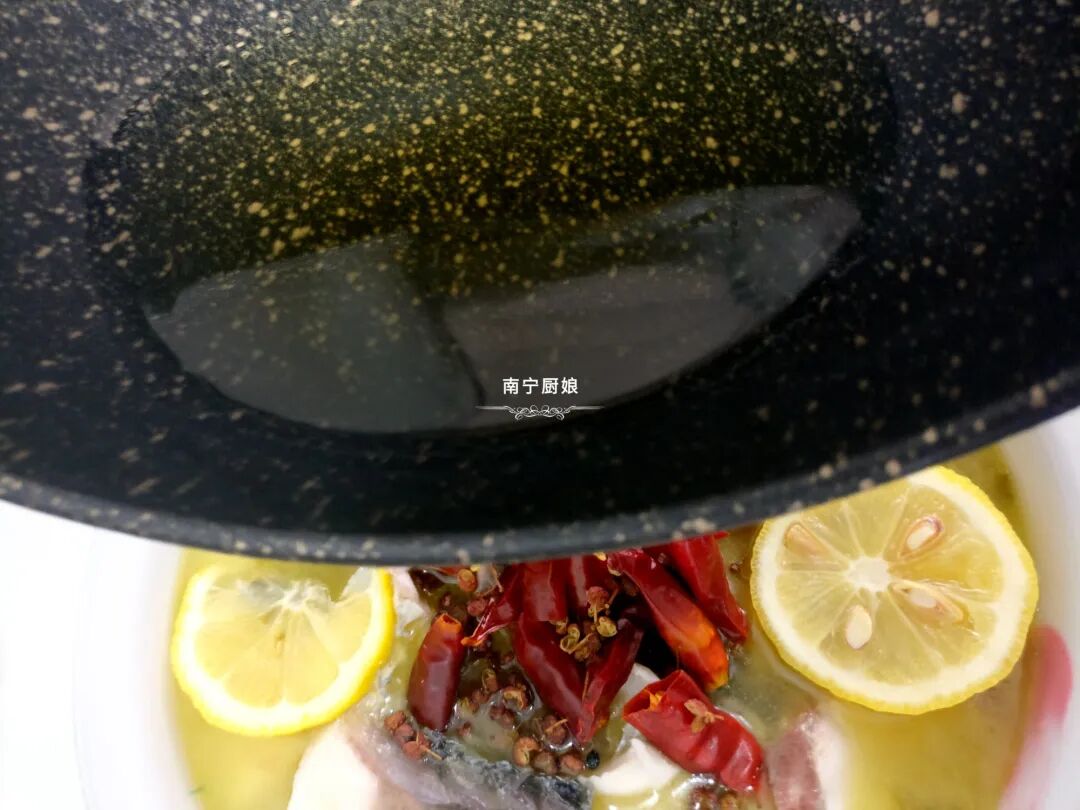 11、重新起锅,烧热2勺油,趁热淋在干辣椒和花椒上,顿时整完鱼汤上都翻滚沸腾了几秒钟,煞是好看,还发出噼里啪啦的油爆声,还阵阵飘来酸酸的的鱼香味