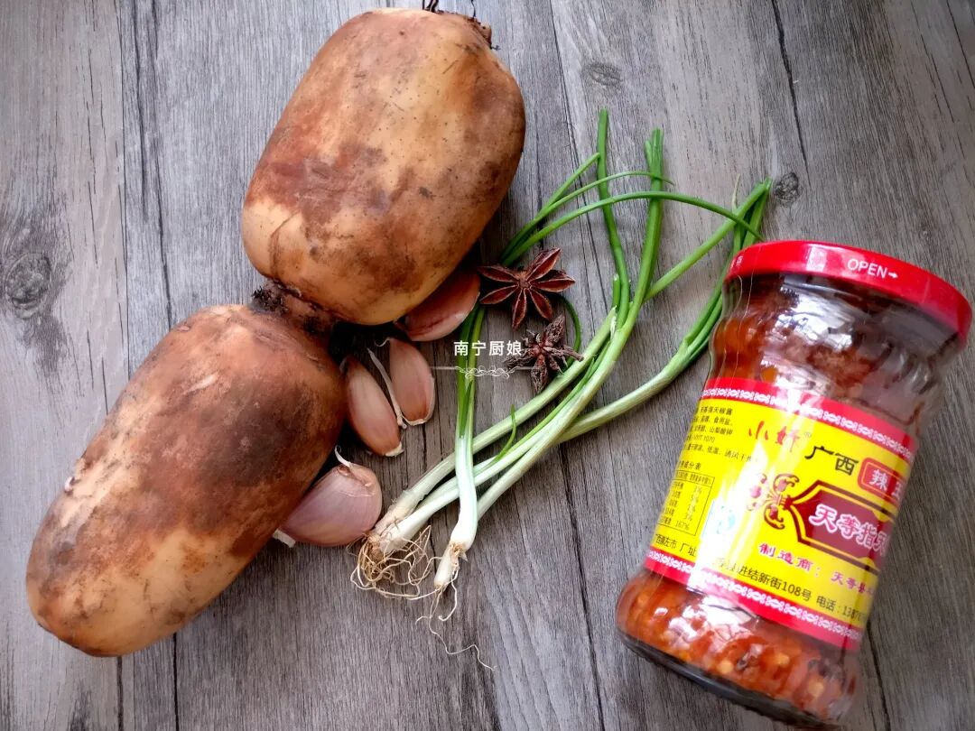 准备好食材:莲藕4节、蒜米4粒、葱花3根、八角1个半、辣椒酱1勺