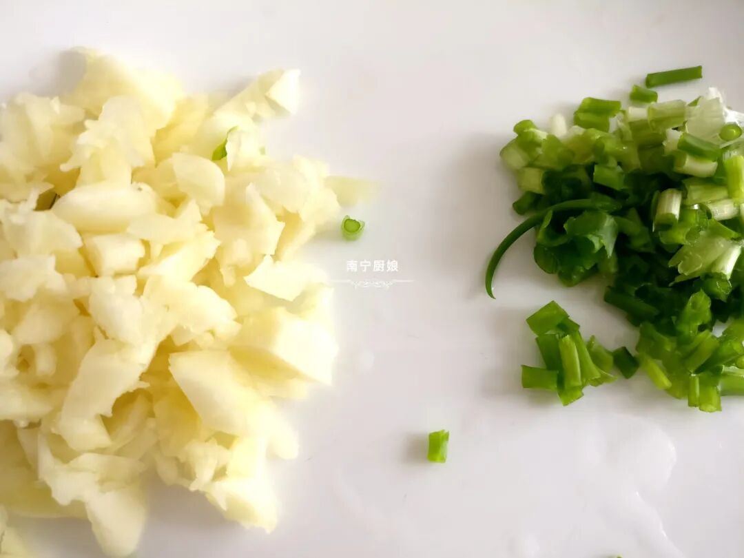 3、趁炖莲藕的空挡,我们把蒜米去皮后切碎,葱花洗净切碎备用