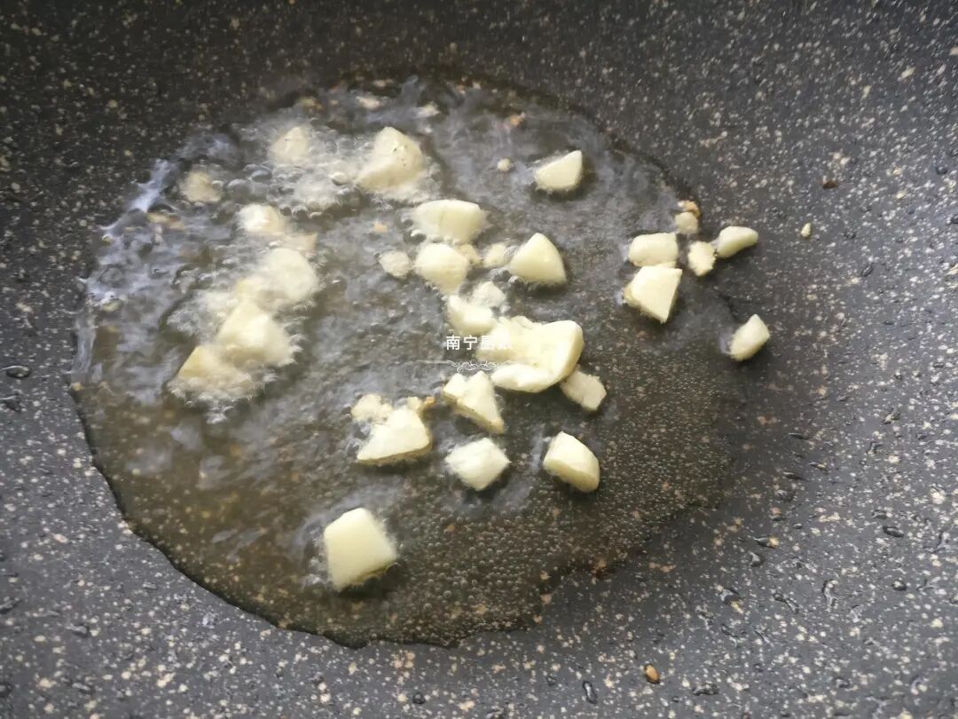 4、把锅架上,倒入适量的花生油小火烧热,倒入蒜米爆香