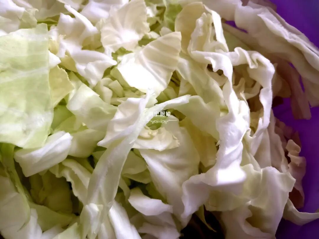 2、包菜去掉外面的坏叶后刀切成条,如果有耐心有时间的,还是建议手撕比较好吃点