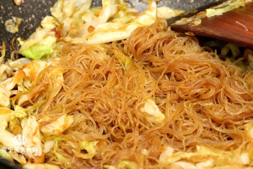 7、最后把粉丝剪短后放入锅里一起翻炒(一定要剪短,要不然粉丝放进锅里会缠绕成一团哦),不用担心粉丝最后放入不入味,其实粉丝的吸附能力超强,一放进去一起翻炒均匀,粉丝就把包菜身上的酱汁给吸过去了,你看,雪白的粉丝已经一身酱油色了,哈哈