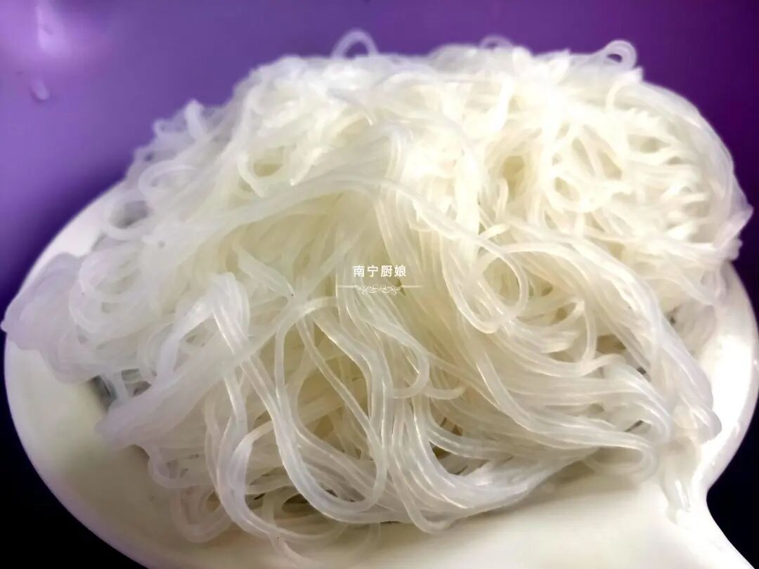 1、烧热一壶水,把粉丝放在盆里,倒入热水烫软后过冷水沥干待用