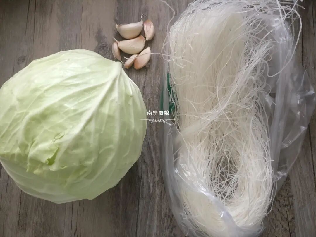 准备好食材:包菜1个、粉丝200克、蒜米4粒、蚝油2勺、生抽2勺