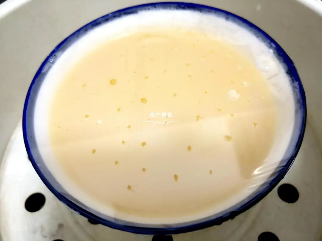 4、蒸蛋的时候一定要盖上东西,比如保鲜膜或者一些碗有透气盖子之类的,记得保鲜膜盖上的时候一定要戳小孔,好让蒸蛋受热后把水汽给排出去,要不然蒸蛋也会不成形。