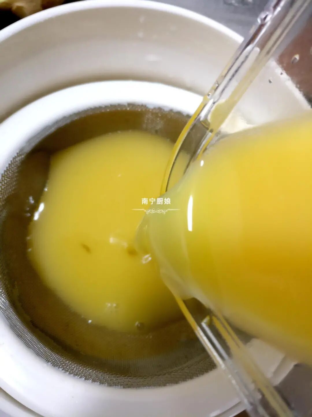 7、为了让鸡蛋液更纯净,我们用过滤筛子把鸡蛋液过滤到另一个碗里