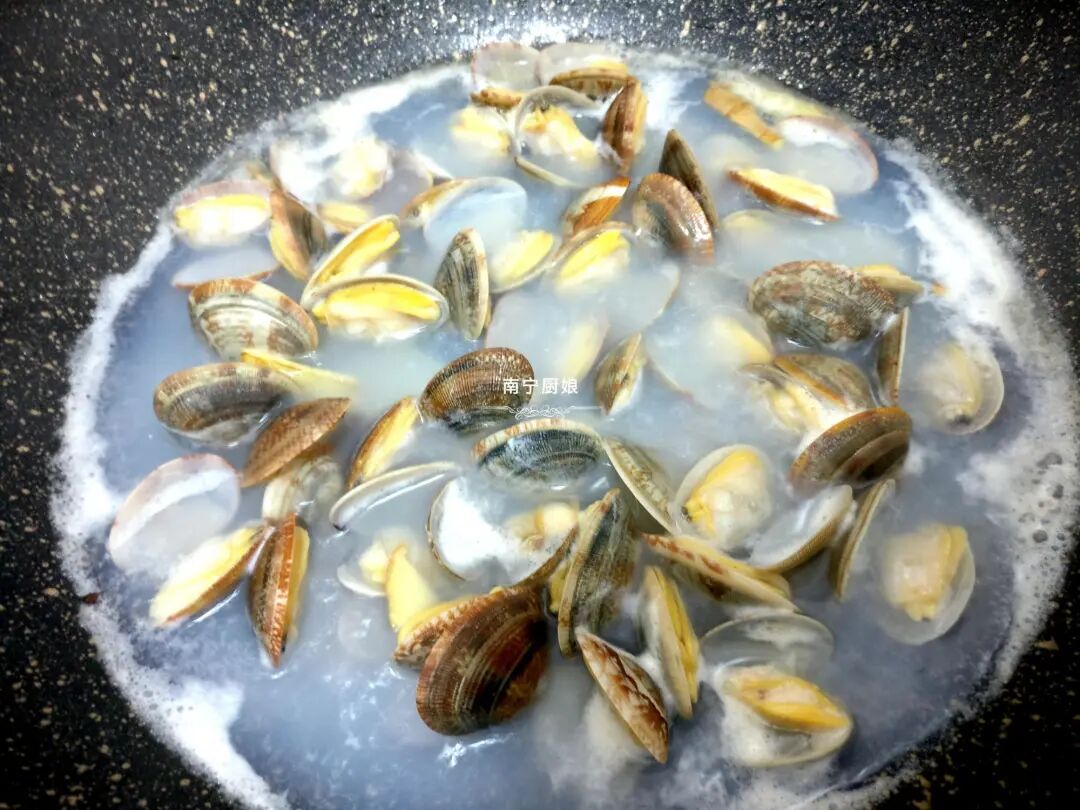 2、倒入开水烧沸,烧制蛤螺都开壳,然后用汤匙把汤汁上面的浮沫给捞掉