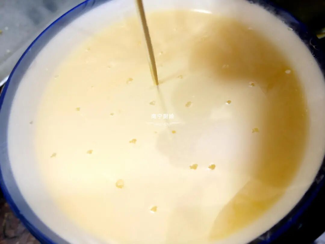 2、在加入水的时候,建议大家加温水,而不是凉水,因为温水能和鸡蛋液更好的融合,也会让鸡蛋液更顺滑,一般放入温水的比例为1:1或者1:1.5基本就很好。