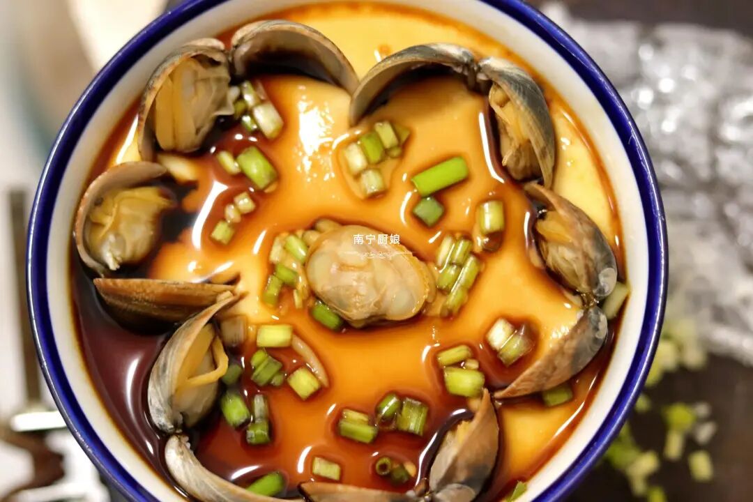 11、倒入一勺蒸鱼豉油,撒入葱花,一碗鲜香嫩滑的蛤螺蒸蛋就做好啦!