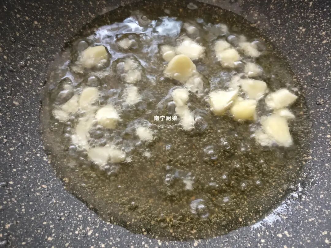 3、起锅倒入适量的花生油小火烧热,把蒜米倒进去爆香