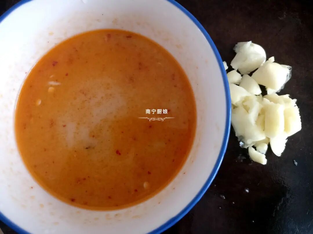 2、把豆腐乳放在碗里捣碎,加入3勺纯净水搅拌成腐乳汁,蒜米用刀拍裂