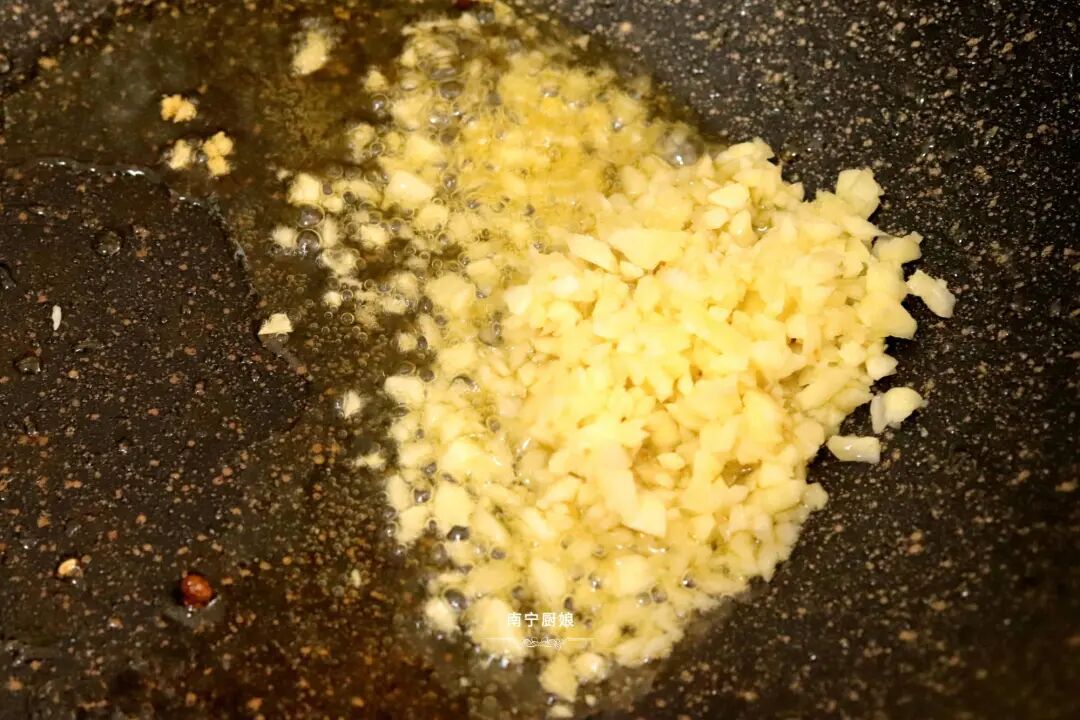 1、在锅里倒入适量的花生油,开小火热油,然后关火,把蒜米倒进去利用余热爆香,盛出装碗