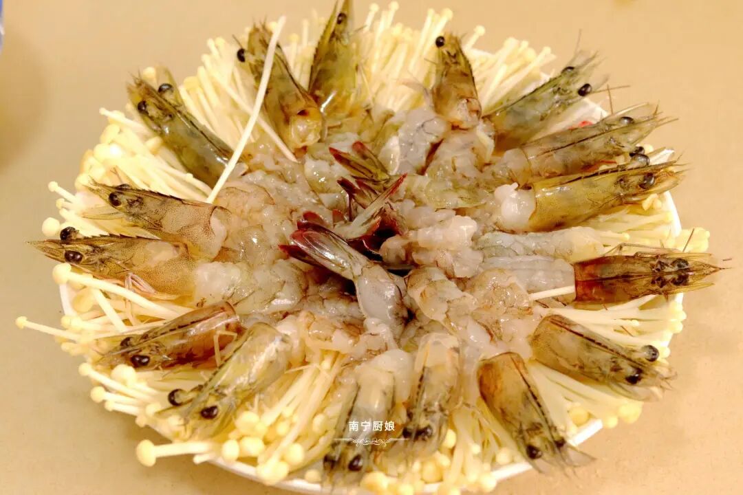 在我们南宁这里,现在淡水虾也不算贵,38元一斤,还是吃得起的,所以今天毫不犹豫地买了40块钱回来尝尝鲜。大家也都知道,虾的营养价值是极高的,常吃具有能增强人体的免疫力和性功能,补肾壮阳,抗早衰。可以多给家里的男儿们多吃。而金针菇被人们称为“增智菇”,那是因为金针菇富含人体所需的氨基酸,而且含锌量比较高,对增强智力尤其是对儿童的身高和智力发育有良好的作用,除此之外,金针菇还具有降低胆固醇、增强对癌细胞的抵抗能力,促进机体的新陈代谢的作用,所以可以多给家人里的小孩和老人多吃也是极好的。