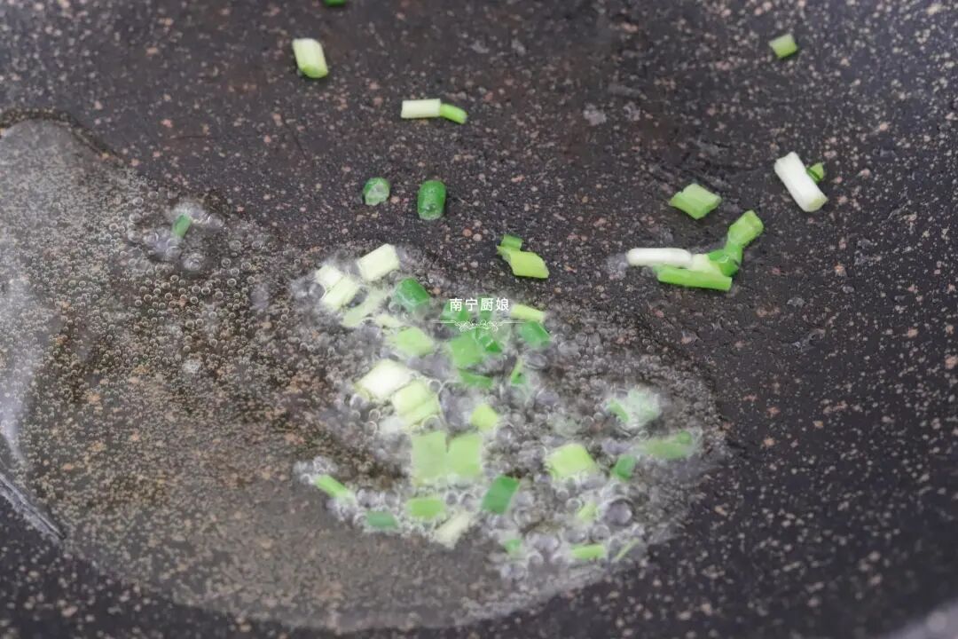 3、在锅里倒入适量的花生油,小火烧热后放入葱花爆香