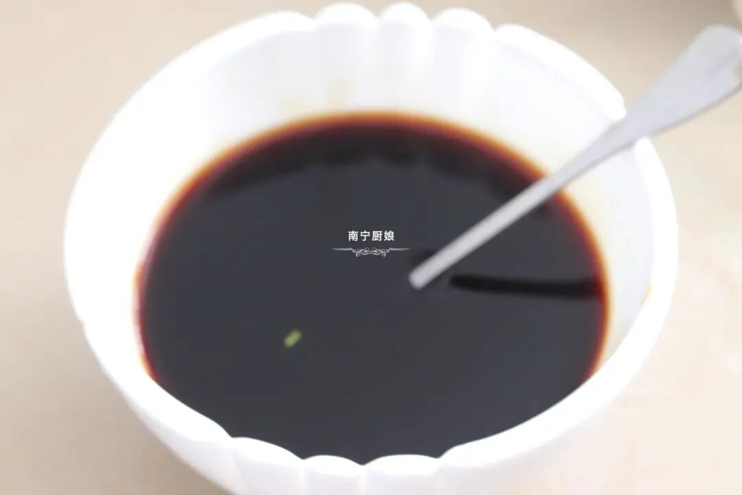 2、在碗里倒入2勺蚝油、2勺生抽、1勺生抽、一勺白砂糖、半勺食盐,适量清水搅拌成酱汁待用