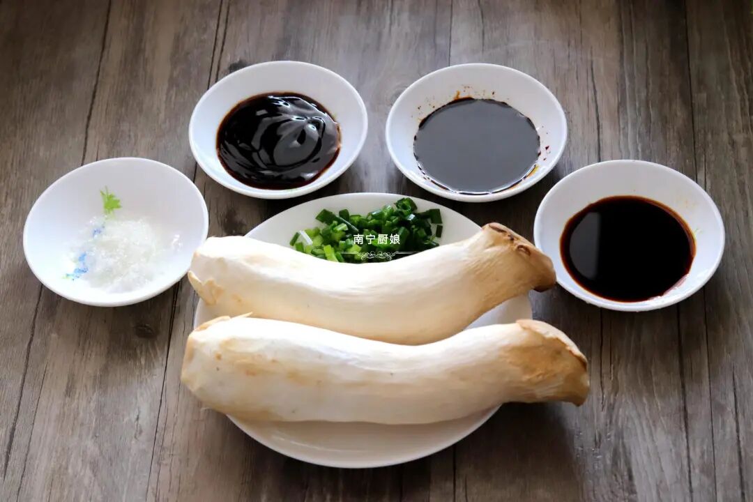准备好食材:杏鲍菇2根、老抽2勺、生抽1勺、白砂糖1勺、食盐半勺、淀粉一勺、葱花1根