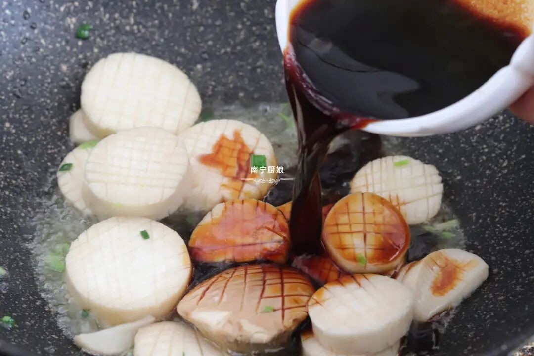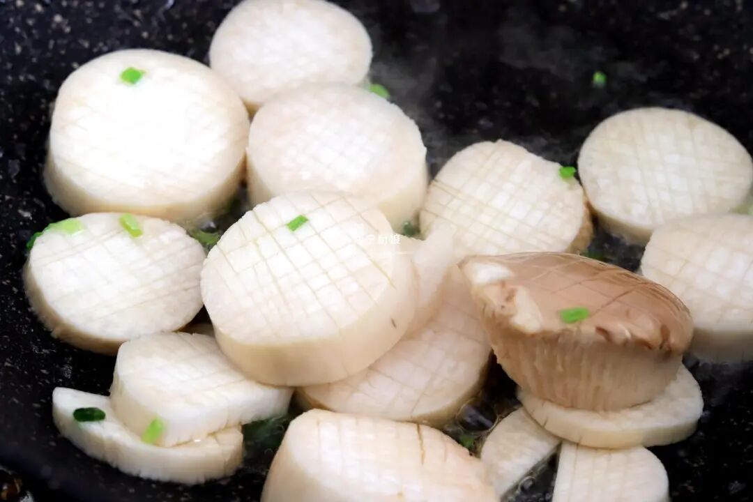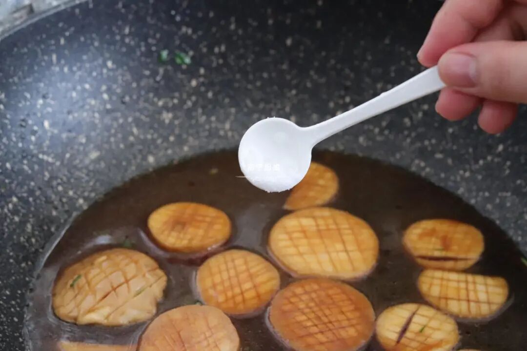 6、烧制汤汁浓稠见底时,放入水淀粉和半勺食盐调味即可出锅,撒入葱花点缀增香