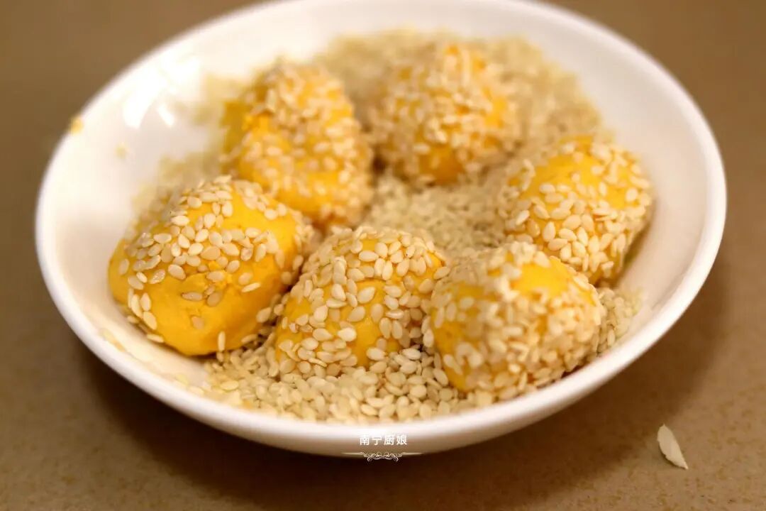 2、然后把面团挤成一个个小剂子,然后把小剂子揉成小圆球后放在白芝麻里打滚,好让南瓜球都沾上白芝麻