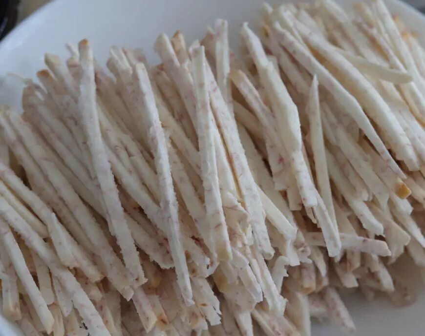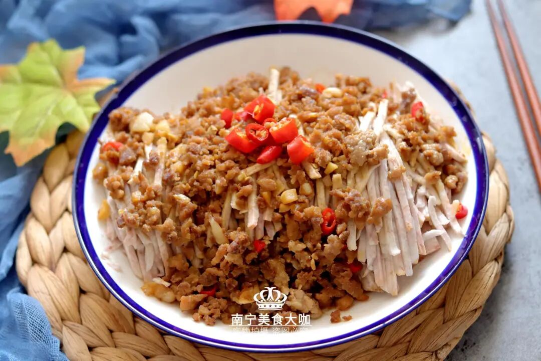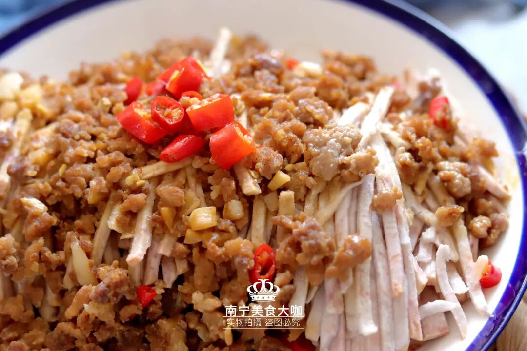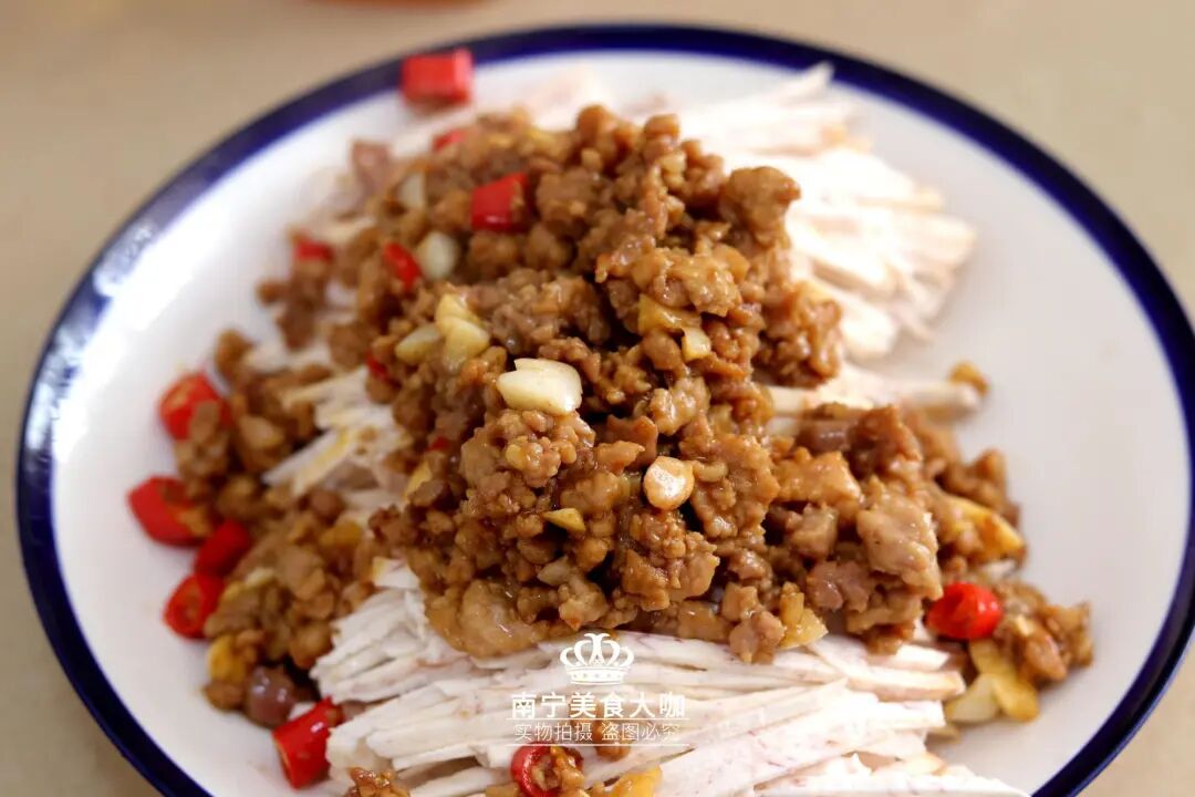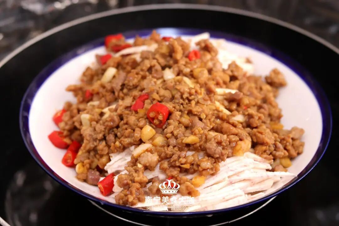 9、把炒好的猪肉碎和辅料一起铺在切成丝的芋头上面