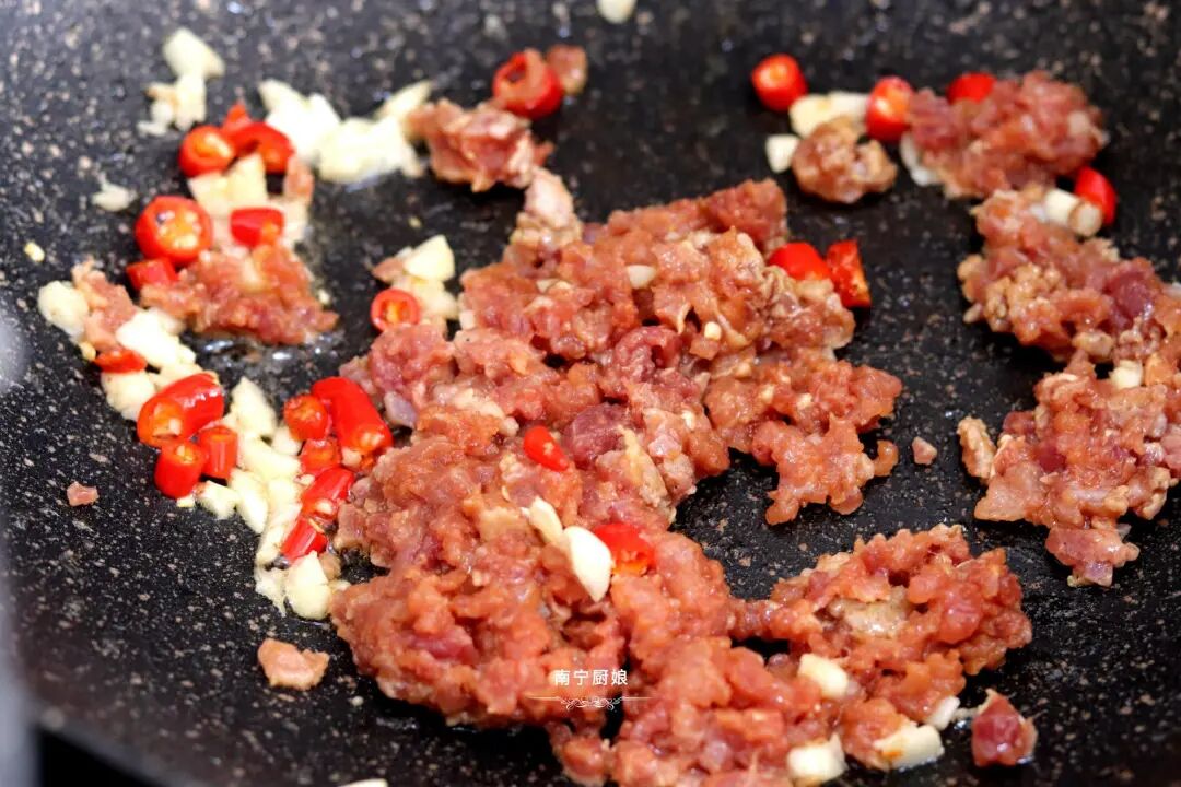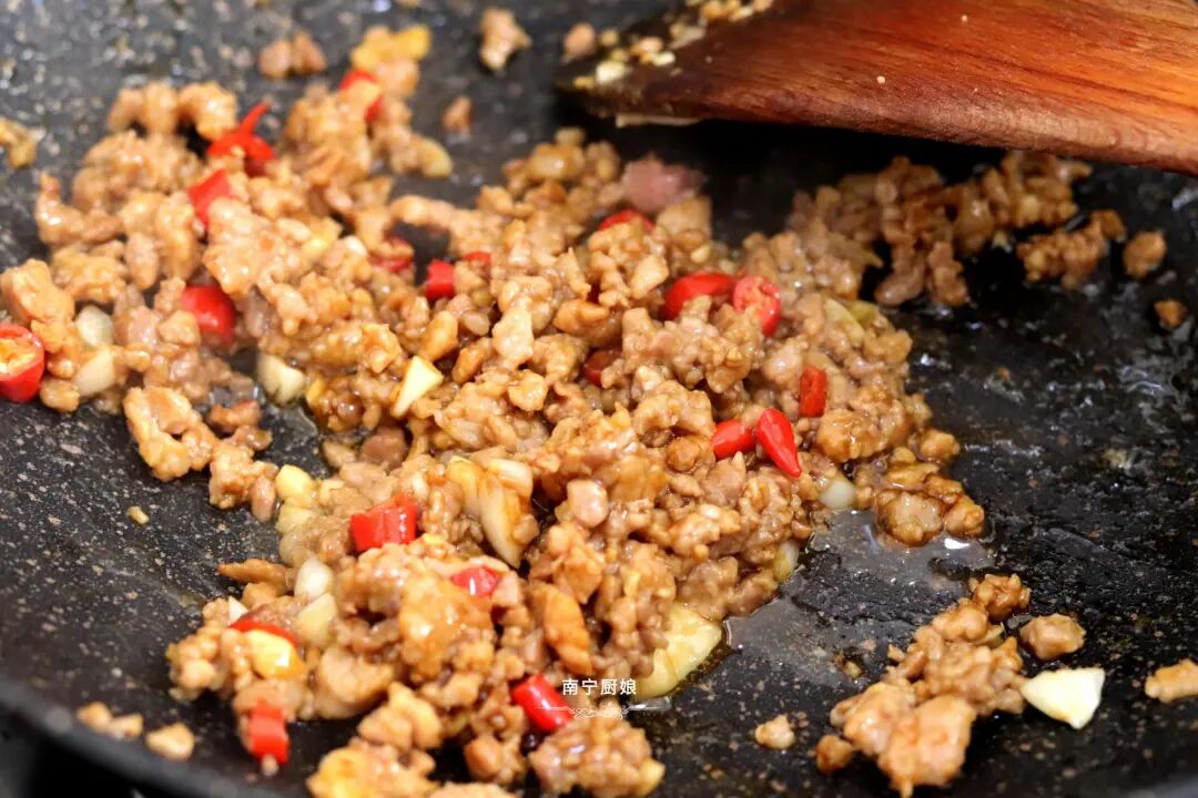 6、把腌制好的猪肉碎倒进去一起翻炒