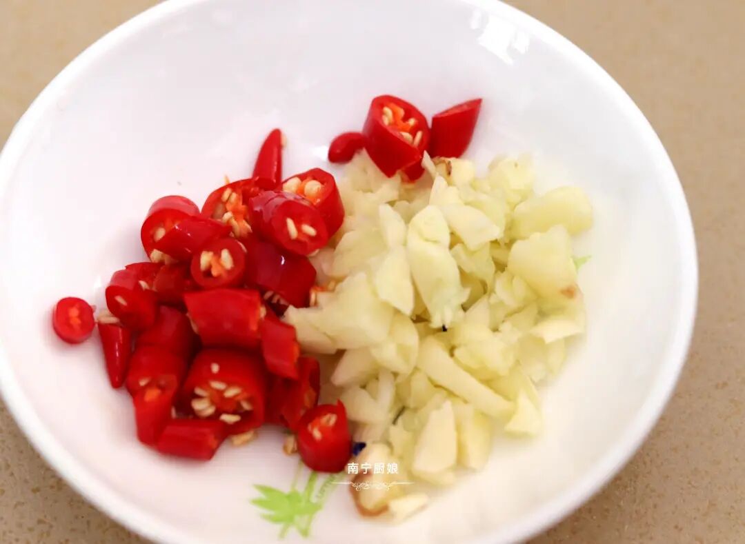 4、把小红椒洗净后切段,蒜米剥皮后切碎