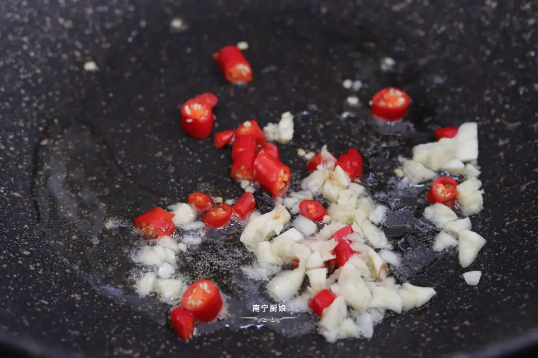 5、在锅里倒入适量的花生油,小火烧热后倒入小红椒和蒜米爆香