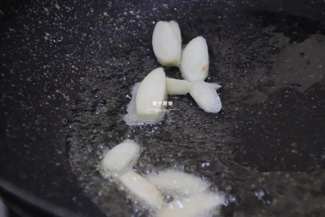 2、起锅,倒入花生油小火烧热,把蒜米倒进去爆香
