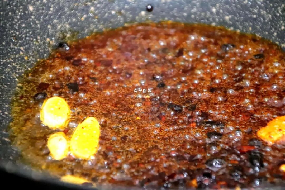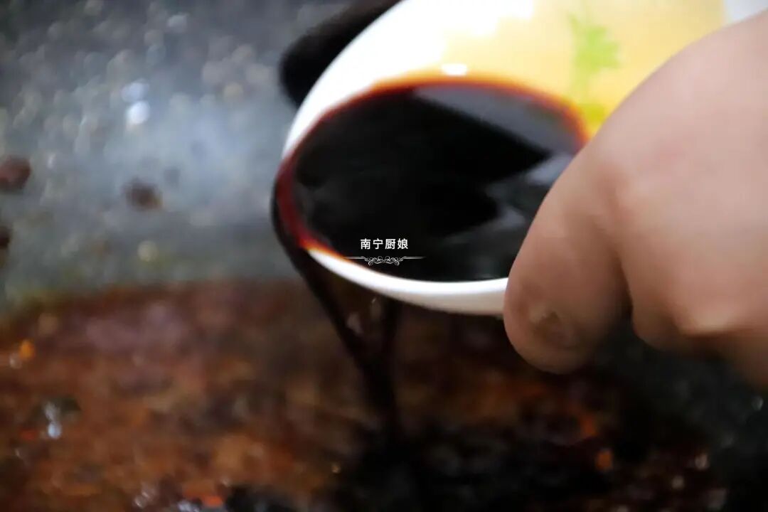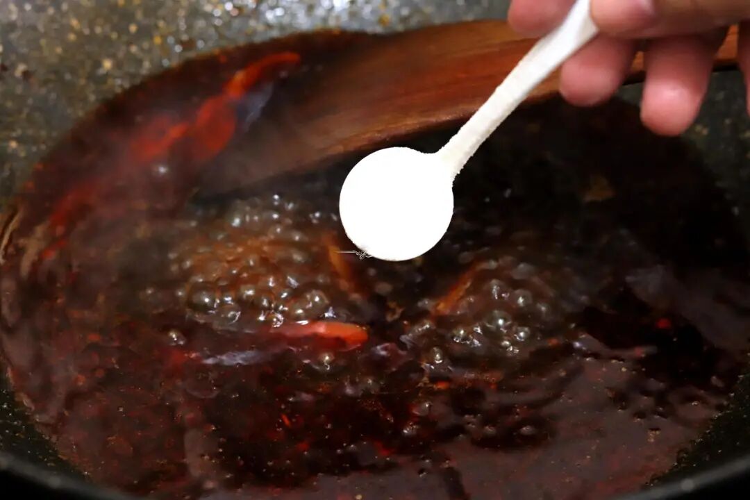 4、放入1勺生抽,小半勺陈醋、半勺白砂糖、1碗清水开大火烧沸