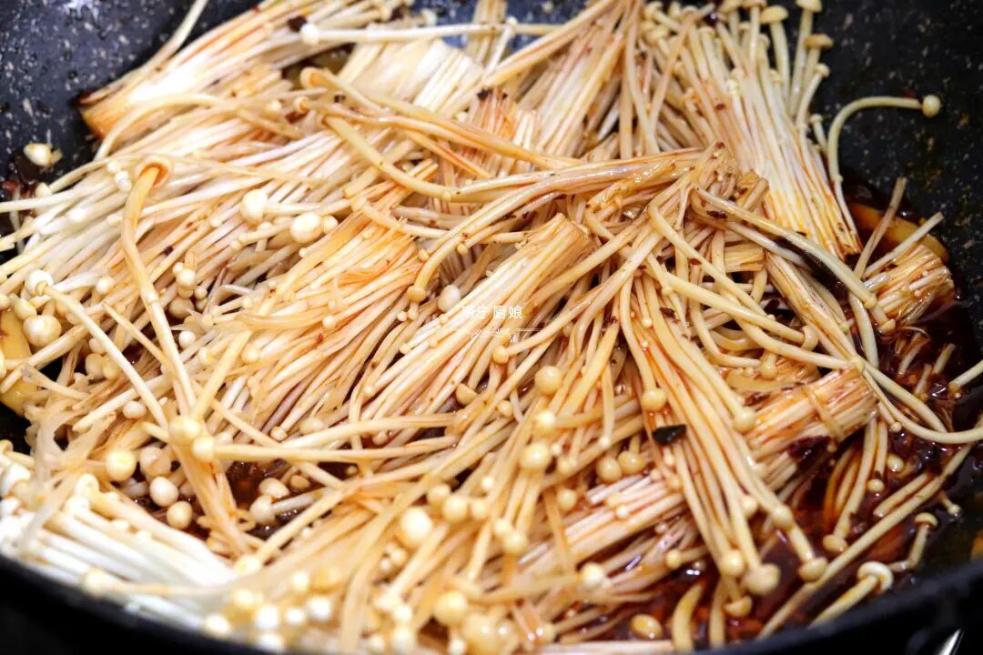 6、把金针菇放进去翻炒均匀,让金针菇都均匀沾满酱汁,然后再开火烧煮半分钟,让金针菇烧软即可关火出锅