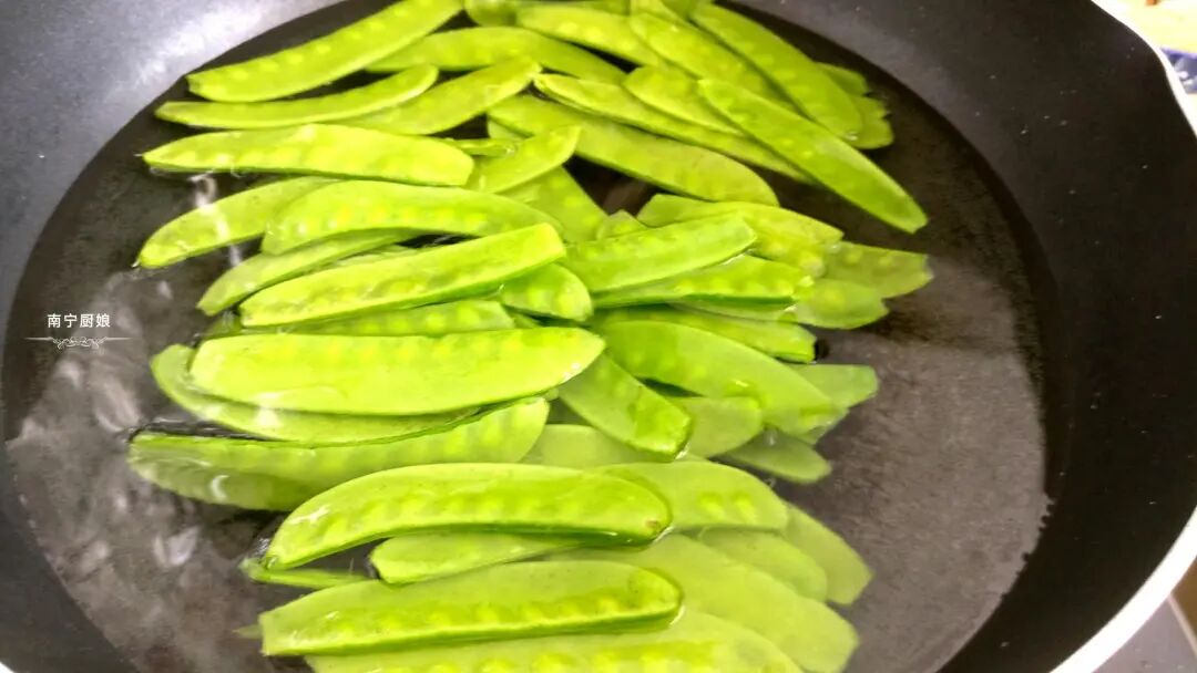 2、在锅里烧热半锅水,滴入几滴油和一勺食盐,把荷兰豆放在锅里焯水30秒后捞出沥干水分备用,很多人省去了这一步,难怪炒出来不够翠绿,也不好吃