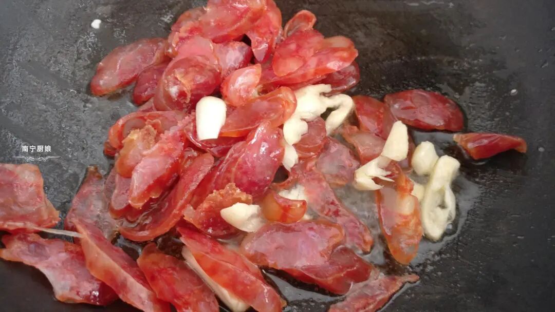 4、把腊肠给倒进去翻炒香,滴入米酒