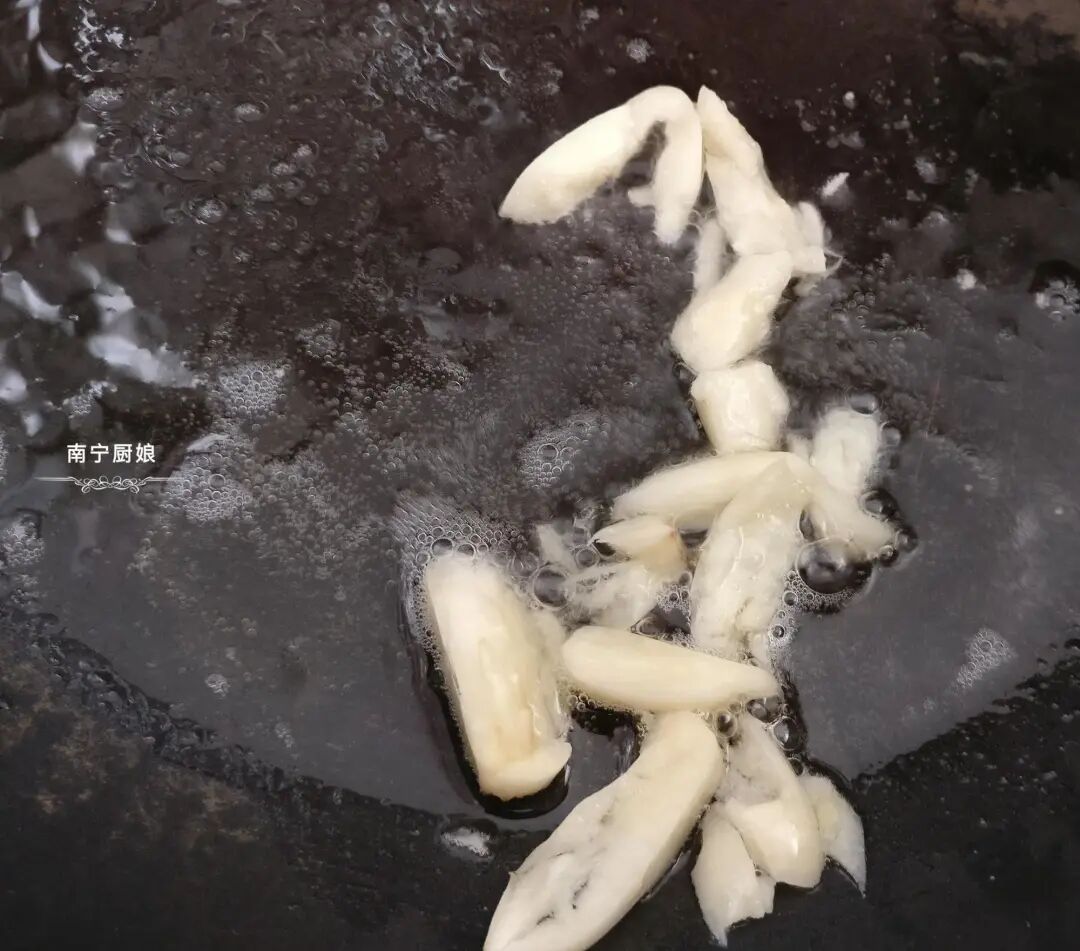 3、蒜米去皮后切片,起锅放入适量的花生油小火烧热,倒入蒜米爆香