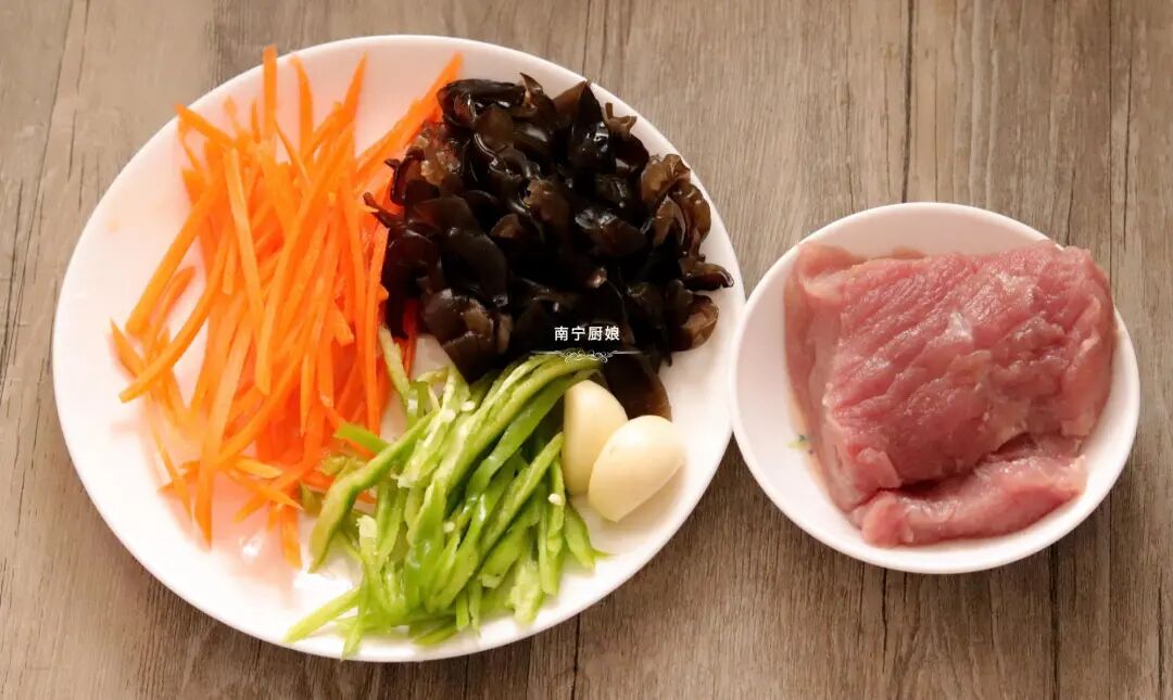 准备好食材:黑木耳6朵切丝、胡萝卜1根切丝、青椒2颗切丝、蒜米3颗切片、猪瘦肉300克切条、淀粉一勺、食盐一勺、白砂糖一勺、陈醋1勺、生抽1勺