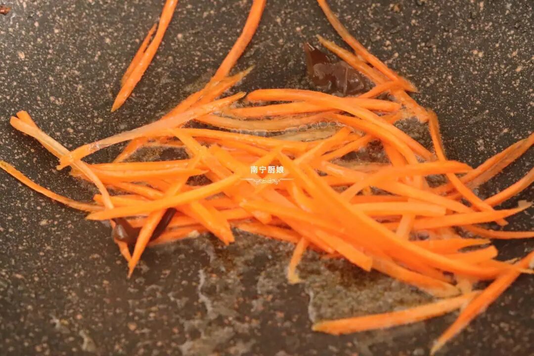 2、可以用刚才炒肉的余油,继续小火烧热后把胡萝卜丝倒进去翻炒软