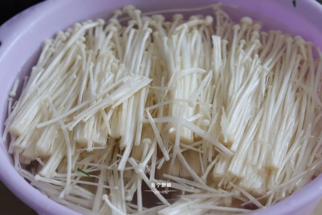 2、把金针菇切掉根部后放在盆里清洗后浸泡10分钟,然后捞出来沥干待用