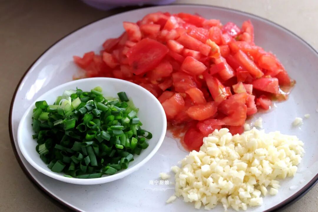 1、番茄去皮后切碎,葱花洗净后切碎,蒜米去皮后切碎备用